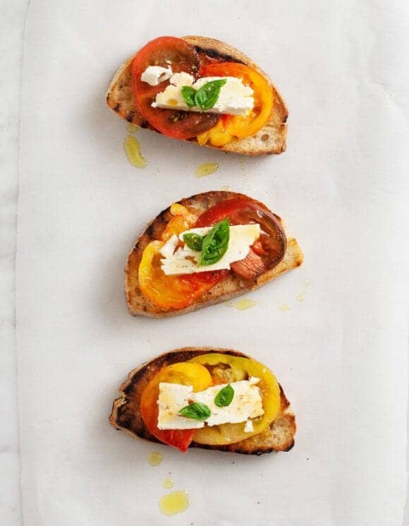 Pictured are a few different tomato varieties, although the deep flavor of the Cherokee Purple works especially well here.