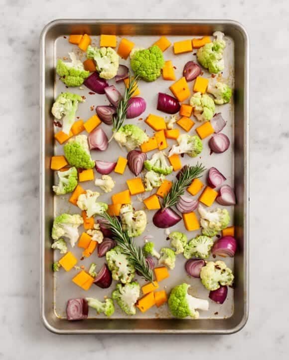 Place butternut squash, cauliflower and cipollini onions on a large baking sheet. Drizzle lightly with olive oil, balsamic vinegar, and toss with chopped garlic, chopped rosemary and a few generous pinches of salt and pepper.