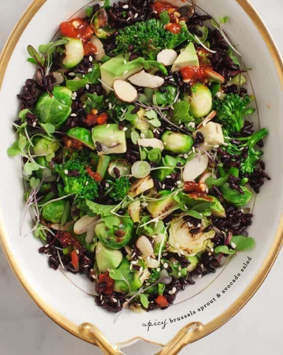 Toss the brussels sprouts & broccolini with the black rice, sliced avocado, mint, almonds, sprouts, and sesame seeds. Taste & toss with more dressing. Serve warm with extra lime slices and more sriracha if you like.
