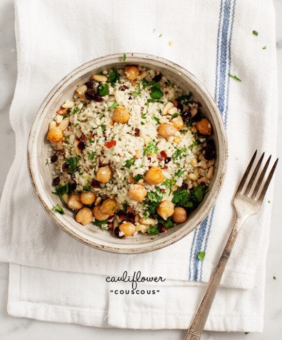 Heat oil in a large skillet over medium heat. Add the cauliflower “couscous” and a few good pinches of salt. Let it gently toast for a minute or so and stir. you should see a few of the bits turning golden brown. (Careful not to overcook you want the pieces tender and not mushy). Toss again and add the nuts and spices and chickpeas. Cook until the spices become fragrant (about 30 seconds more) and remove from heat.