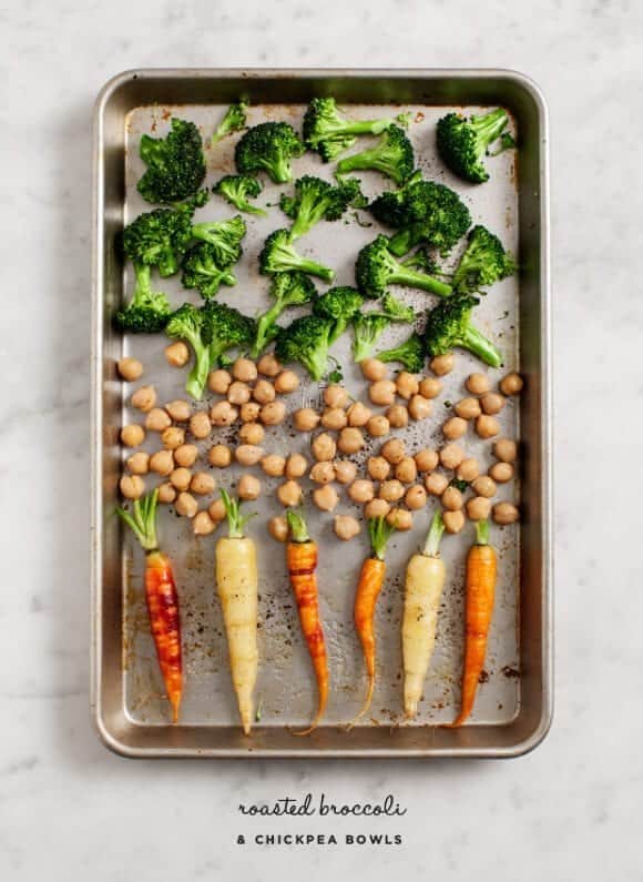 Place vegetables and chickpeas on a large baking sheet so that they're not touching too closely (use 2 sheets if you have to). Drizzle and toss with olive oil, salt and pepper. Roast until golden brown (20-30 minutes total, but take a look after the first 20 - remove the broccoli first if necessary).