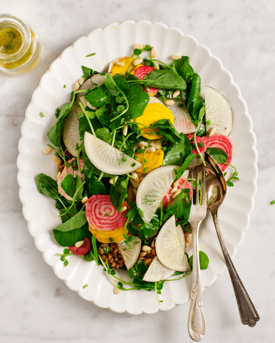 This spring root veggie salad is a delicious healthy lunch. Featuring beets 2 ways, it's a fun showcase of their sweetness & crunch.