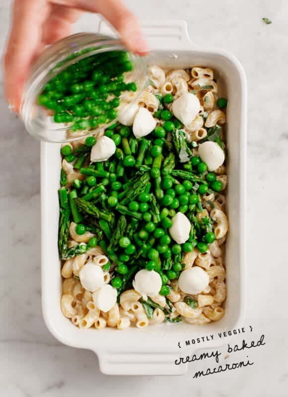 Toss about ¾ cups of the cashew cream with the cooked pasta. (I did this right in my baking dish to dirty less dishes). Add the asparagus, peas, mozzarella, herbs, a few pinches of salt & pepper. Fold everything together so that all ingredients are coated and evenly disbursed, then gently press it into the pan to form an even layer.