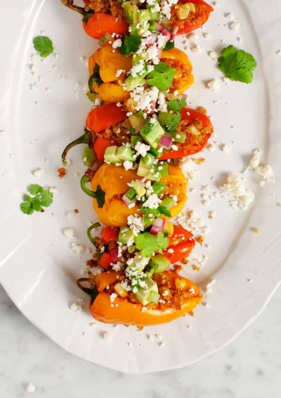 These work great as leftovers - store extra filling (& salsa) in the fridge. Stuff the peppers as you're ready to bake them.