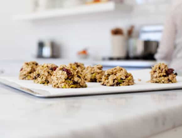Using a damp ¼ cup measure, scoop cookie dough onto baking sheet, flatten slightly, and bake 15 minutes or until golden around the edges. Using a spatula, carefully transfer cookies to a wire rack. They will firm up when completely cool. Store leftover cookies in an airtight containerl in warm weather, store them in the fridge.