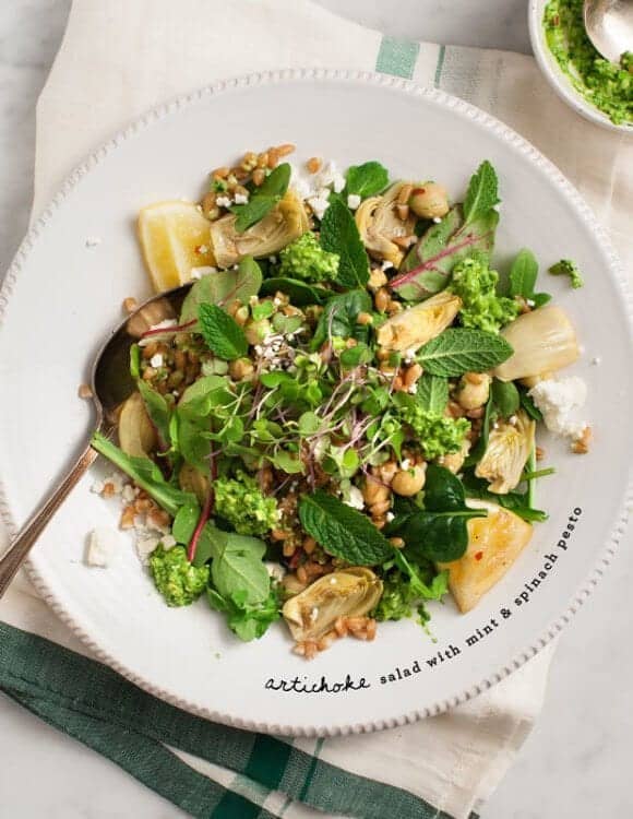 This hearty artichoke salad is a must-try spring recipe! The lemony artichokes and a fresh mint pesto fill it with bright flavor, making it fun & satisfying to eat.