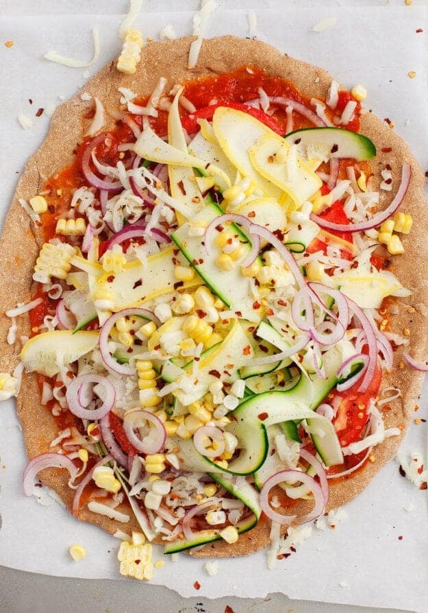 Remove from the oven and top the crust with the tomato sauce, scallions, half of the onions, half of the cheese, sliced tomatoes, a pinch of salt and pepper, zucchini, yellow squash, the remainder red onions, corn, and the remainder of the cheese. Top it all with a few pinches of red pepper flakes and another pinch of salt and pepper. Bake until the cheese is melted and bubbling, about 5 more minutes.