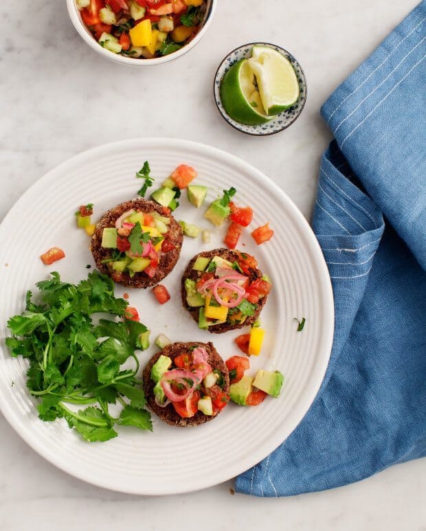 Drizzle each patty with a bit of olive oil and bake for 15 minutes (or until they're firm enough to flip without falling apart). Turn and bake for an additional 10 to 12 minutes, or until the patties are lightly crisp. Top with the Heirloom Mango Pico and serve.
