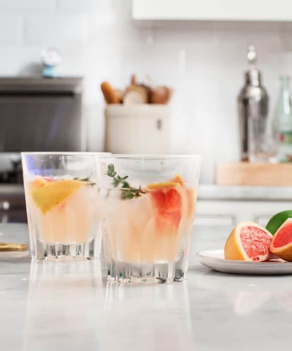 Pour into glasses filled with ice. Garnish with grapefruit wedges and thyme sprigs.