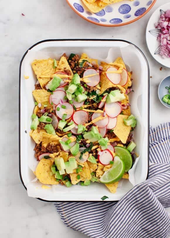 Assemble the nachos: On a large platter, arrange half of the tortilla chips in a single layer, top with ¾ of the taco “meat,” the kale, half the scallions, and half the pumpkin cashew cream. Add another layer of chips and top with the remaining taco meat, remaining cashew cream, radishes, avocado, remaining scallions, diced red onion, and cilantro. Top with a squeeze of lime juice and serve with the remaining lime slices.
