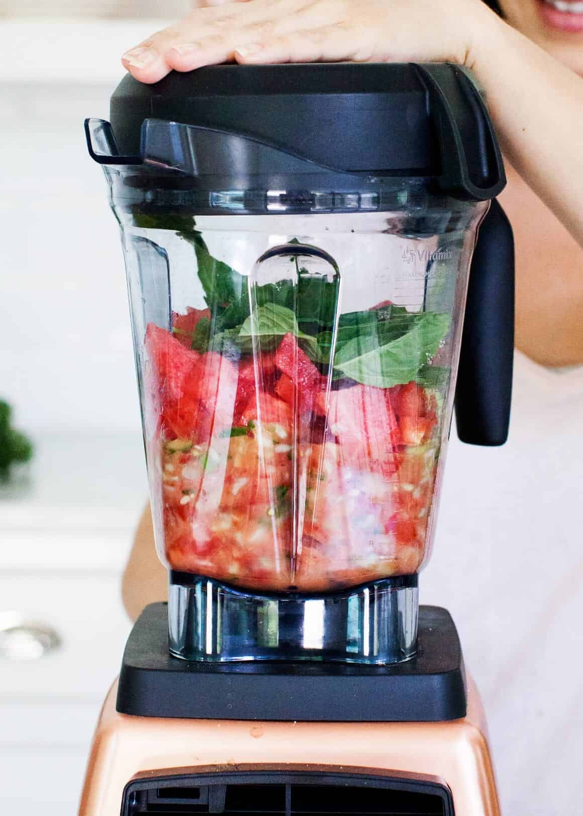This super refreshing watermelon gazpacho hits the spot on hot summer days. This recipe makes a big batch, so store the leftovers in the fridge for easy lunches all week long.