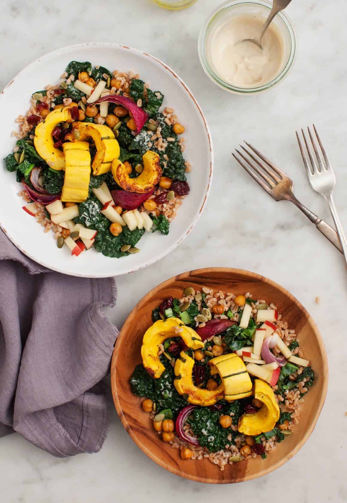 In a large mixing bowl, combine the ½ tablespoon of olive oil, lemon juice and a few pinches of salt and pepper. Peel the roasted garlic cloves and smush the softened garlic into the olive oil mixture. Add the kale and gently massage it until it’s lightly wilted and tender. Stir in the farro and a generous drizzle of the tahini sauce. Add the roasted delicata squash, red onions, chickpeas, apple, cranberries and pepitas. Season to taste and add more dressing, if desired.