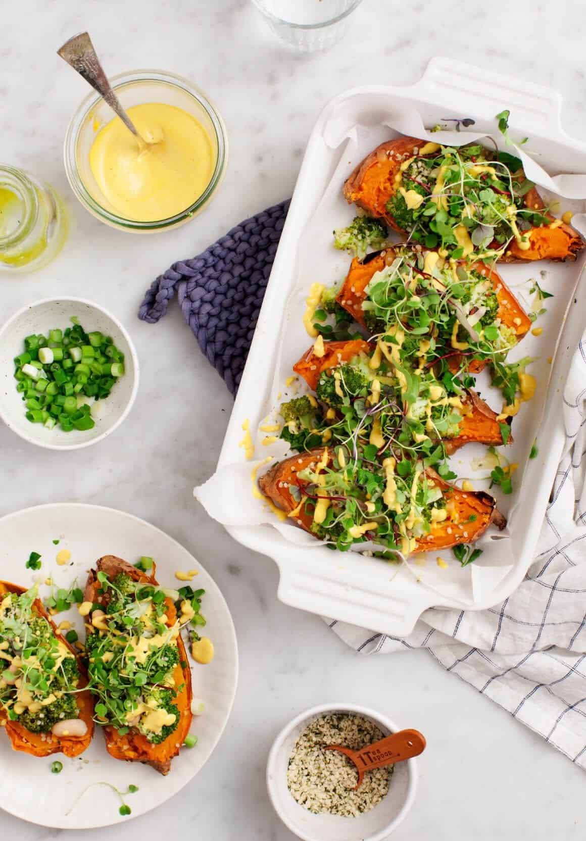 Fill each potato half with a scoop of the cashew cream, some of the cheddar cheese (if using), the broccoli mixture, more cheese, scallions and sprinkle with the hemp seeds. Bake for 10 more minutes or until the cheese is melted. Garnish with the parsley and/or microgreens and serve with the remaining cashew sauce for drizzling. (tip: if your cashew sauce is too thick to drizzle, stir in a little bit of water until it's a thinner consistency).
