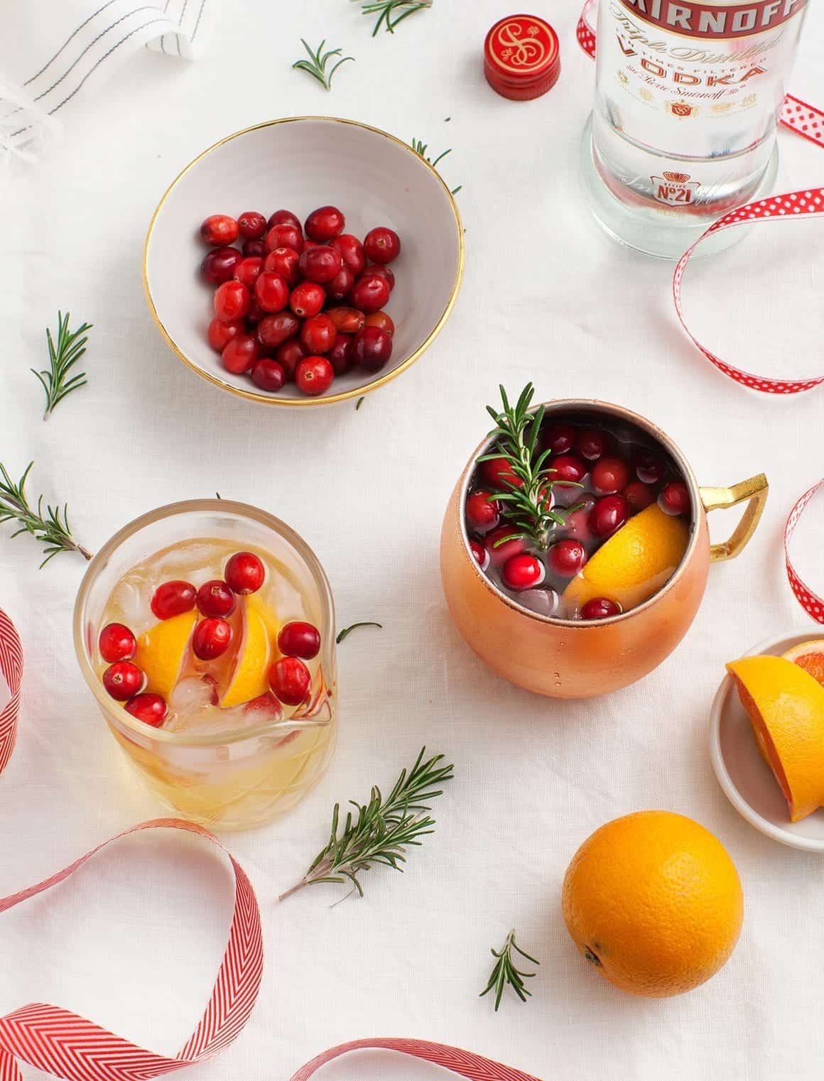 In a copper mug, mix together the ginger kombucha, vodka, orange juice, and crushed ice. Stir to combine. Garnish with cranberries, an orange wedge, and a sprig of fresh rosemary.