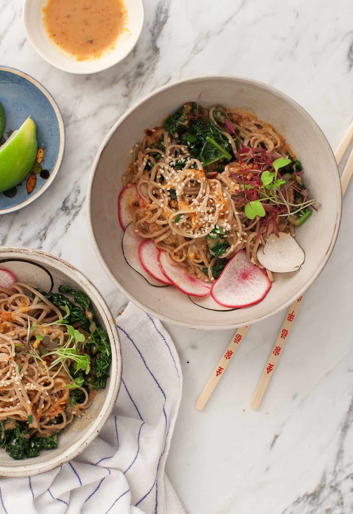 Heat a drizzle of olive oil in a medium skillet over medium heat. Add the kale and sauté until wilted, 1 to 2 minutes. Turn the heat off and stir in the chives. Add the soba noodles to the kale/chive mixture and toss. Drizzle with ¾ of the sesame sauce and toss again. Taste and add the remaining sauce as desired. Assemble four individual serving bowls with the soba/kale mixture, radish and turnip slices, microgreens, if using, and sesame seeds. Serve with lime slices and extra chile-garlic paste on the side.