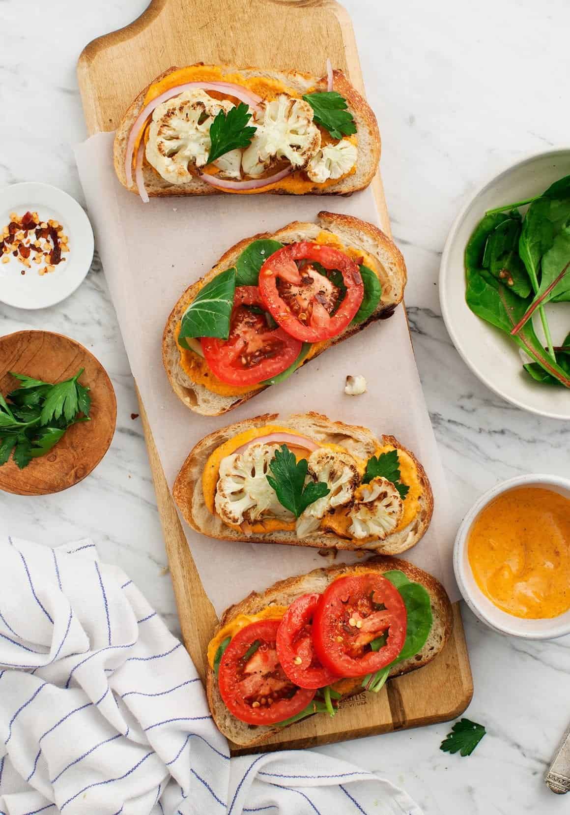 Assemble the sandwiches with the romesco sauce, salad greens, red onions, tomato slices and roasted cauliflower and a few sprigs of parsley.