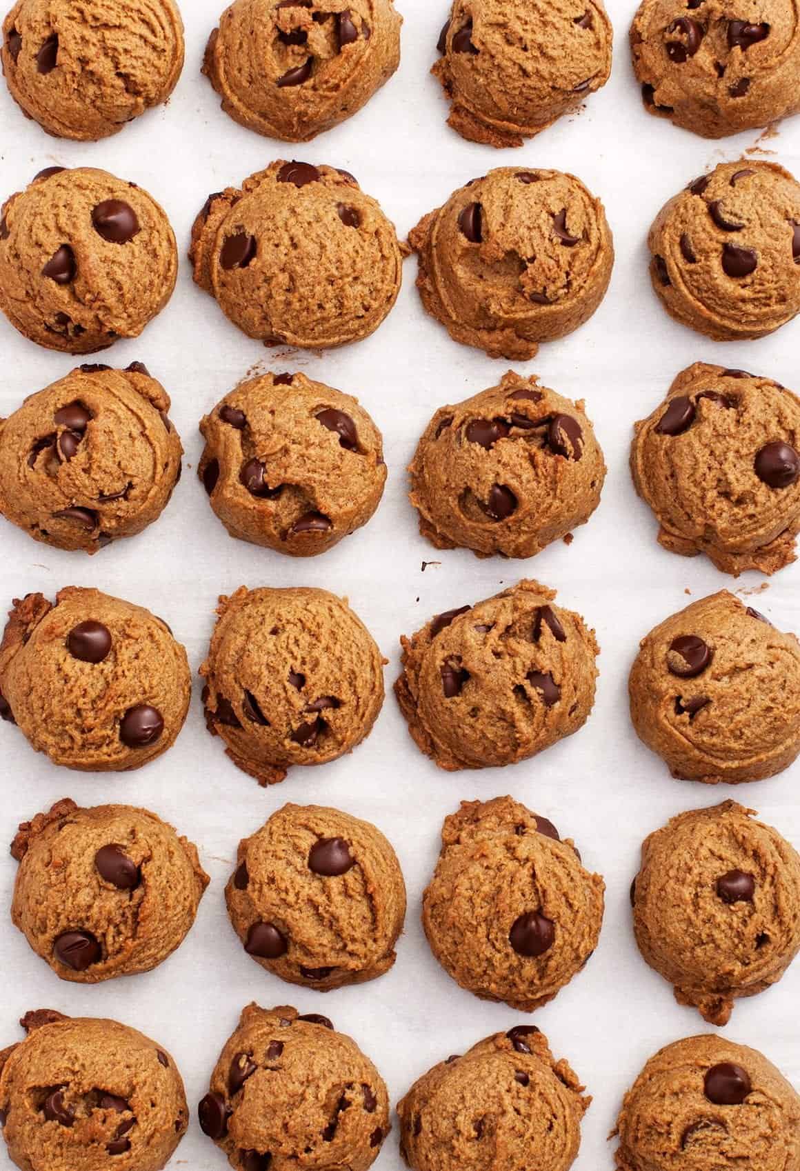 Make these vegan by using vegan chocolate chips and omitting the eggs. Kathryne notes that egg free cookies will be lighter and have a more meringue-like texture that's slightly gritty.