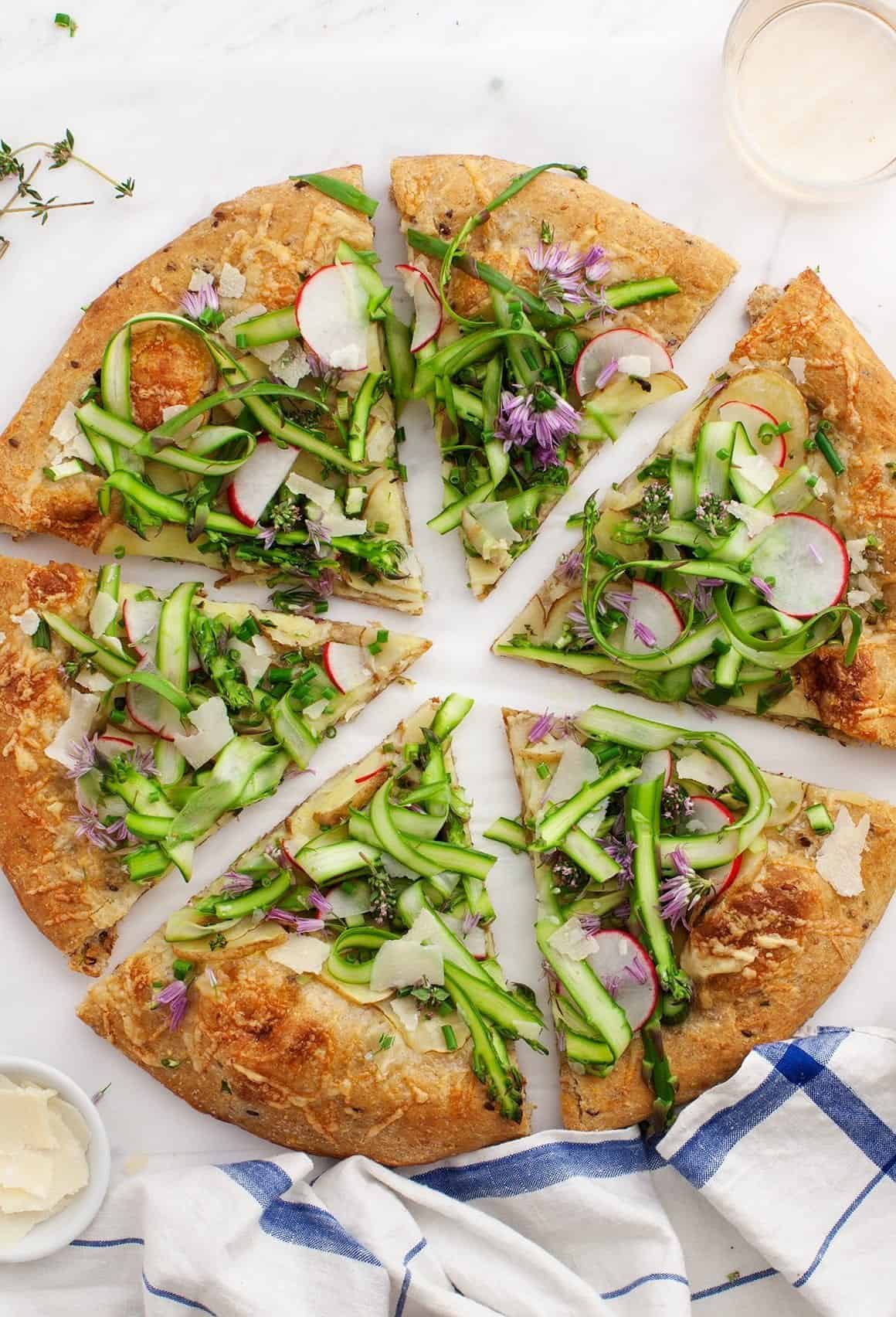 This gorgeous asparagus pizza is the best way to celebrate spring! I used chive blossoms and thyme flowers, but if you're not able to find any, additional chopped chives and thyme leaves would work just as well.