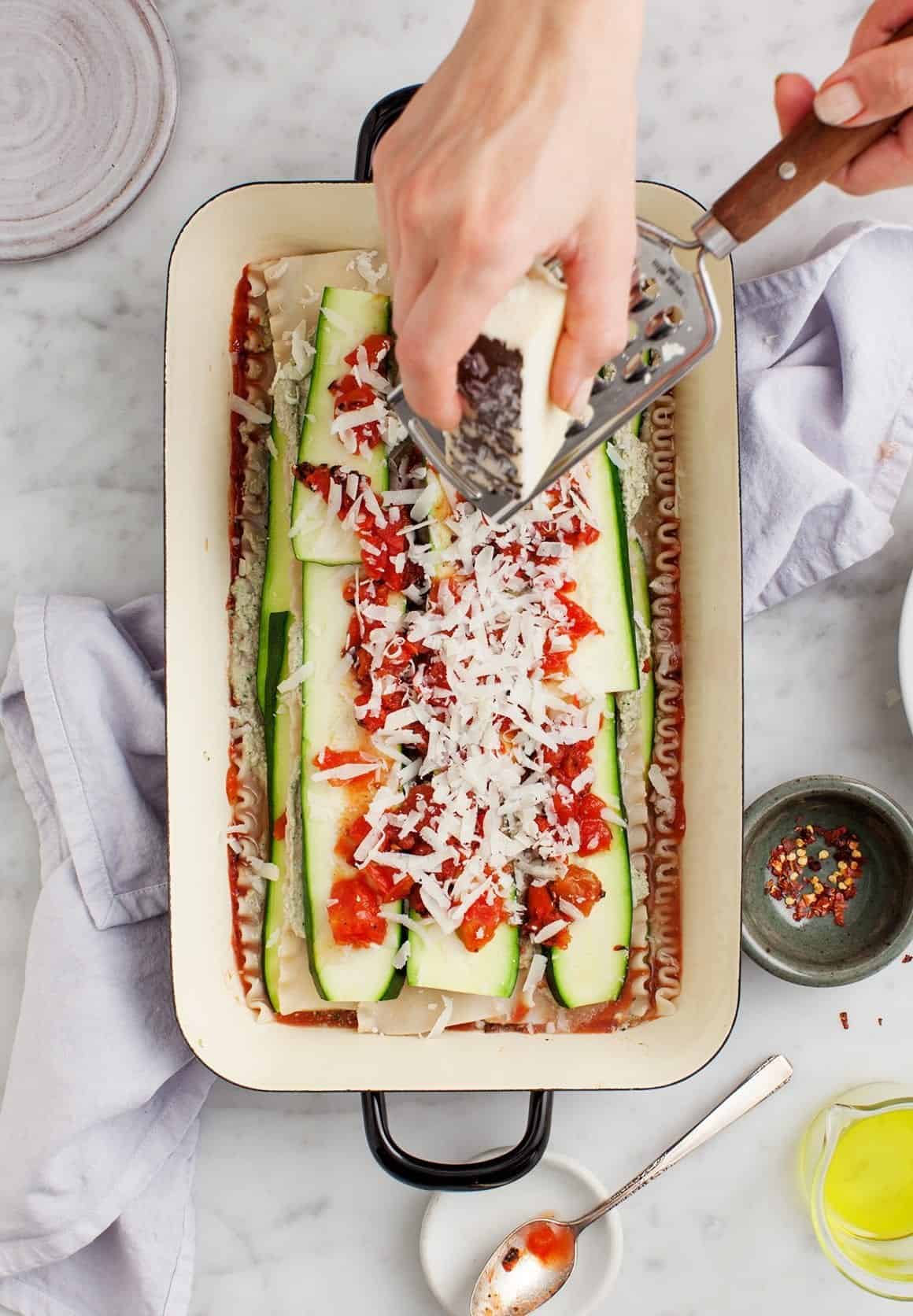 This zucchini lasagna recipe uses zucchini two ways! I blend it into the creamy filling and layer zucchini planks into the lasagna itself.