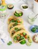 Fill each tortilla with the cabbage, sliced poblanos and shallots, the butternut squash, avocado, cilantro, a scoop of aioli sauce, and the serrano peppers, if using. Serve with the remaining sauce and the lime slices.