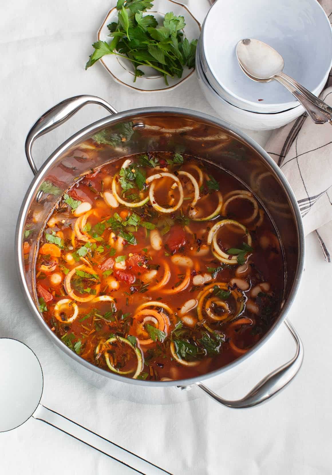 This vegetable noodle soup is full of spiralized zucchini & sweet potato. A healthier version of minestrone, its leftovers keep well for lunches throughout the week!