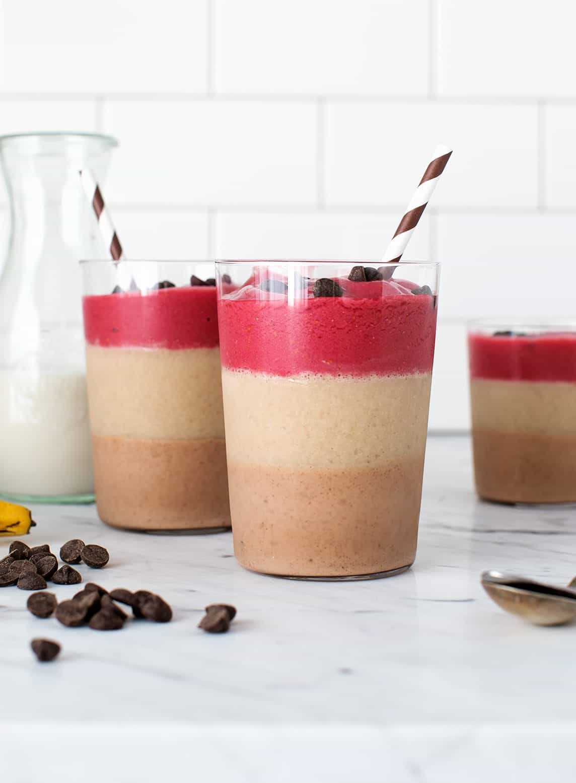 Make the top layer: Combine the strawberries, raspberries, and almond milk in a blender and blend until smooth. This layer will be very thick. Remove the glasses from the freezer and spoon the last layer onto the smoothies. Sprinkle with chocolate chips, if desired.