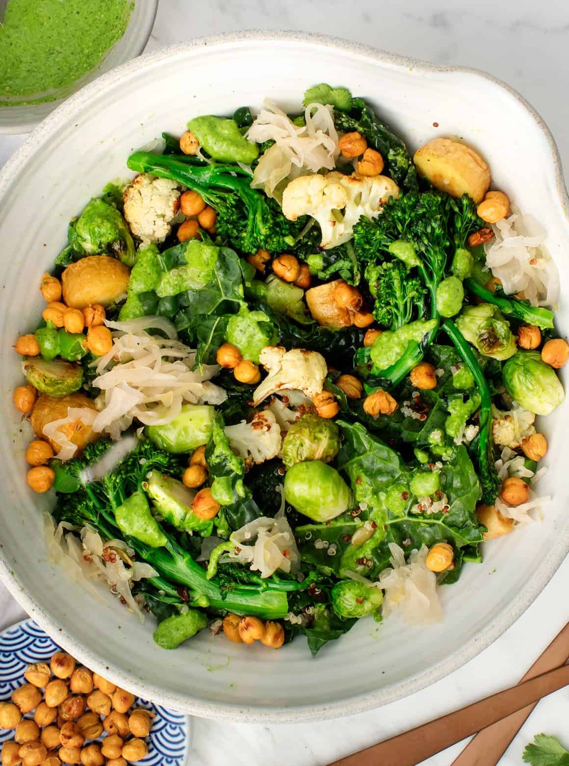 Mix the grain bowl leftovers into the kale salad, along with a few more scoops of the pesto sauce. Add the chickpeas and serve with more sauce, as desired