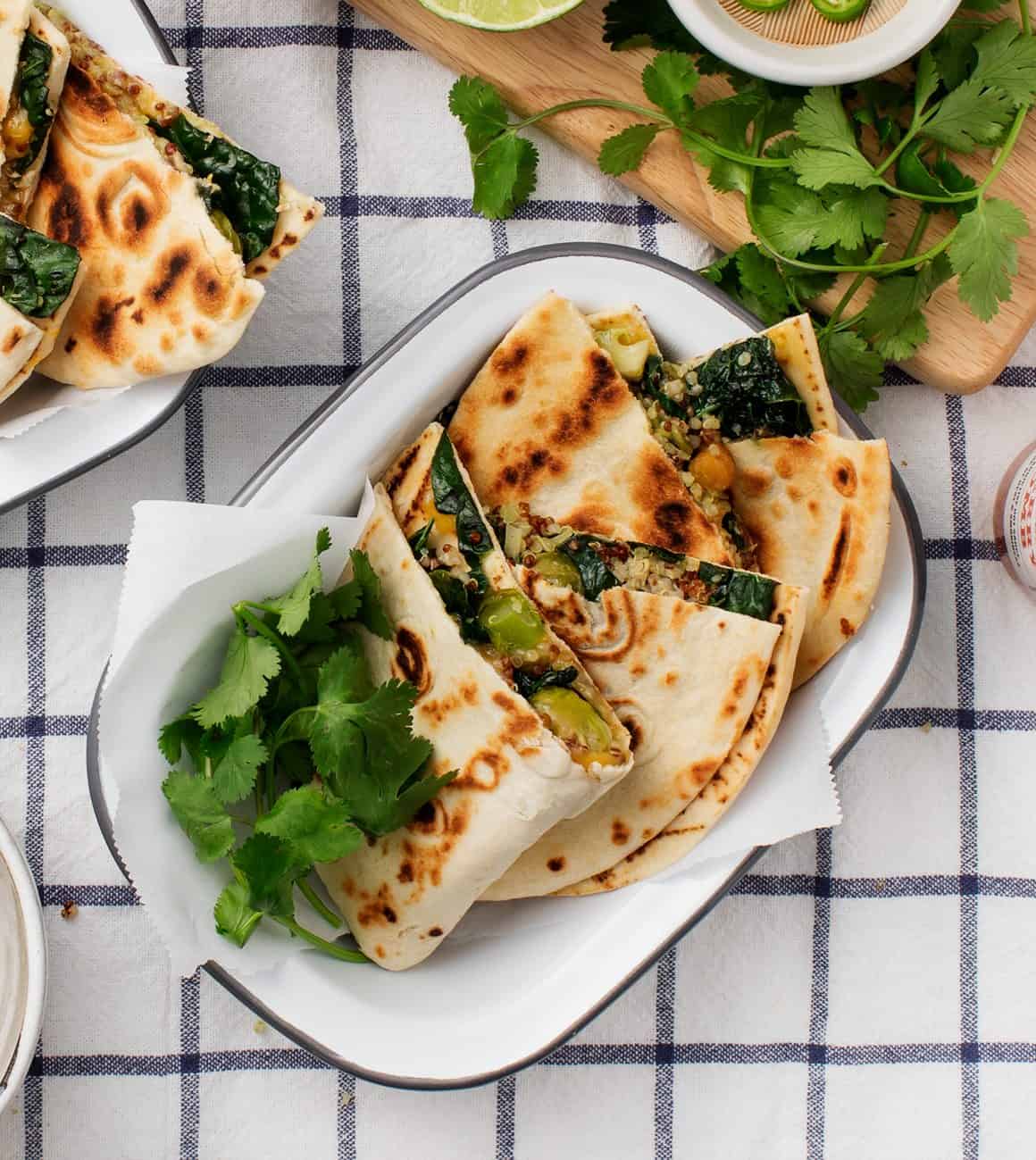 Assemble the tortillas with the shredded cheese and the kale/quinoa mixture. Wipe out the pan, and heat it to medium, with a drizzle of olive oil. Fold each filled tortilla in half and place each into the pan (you may have to work in batches). Heat the quesadillas about 2 minutes per side or until nicely charred. I like to put a loose cover on so that the steam helps the cheese melt. Repeat with all quesadillas. Serve with the remaining salsa, the avocado, lime wedges, peppers or hot sauce, and cilantro, as desired.