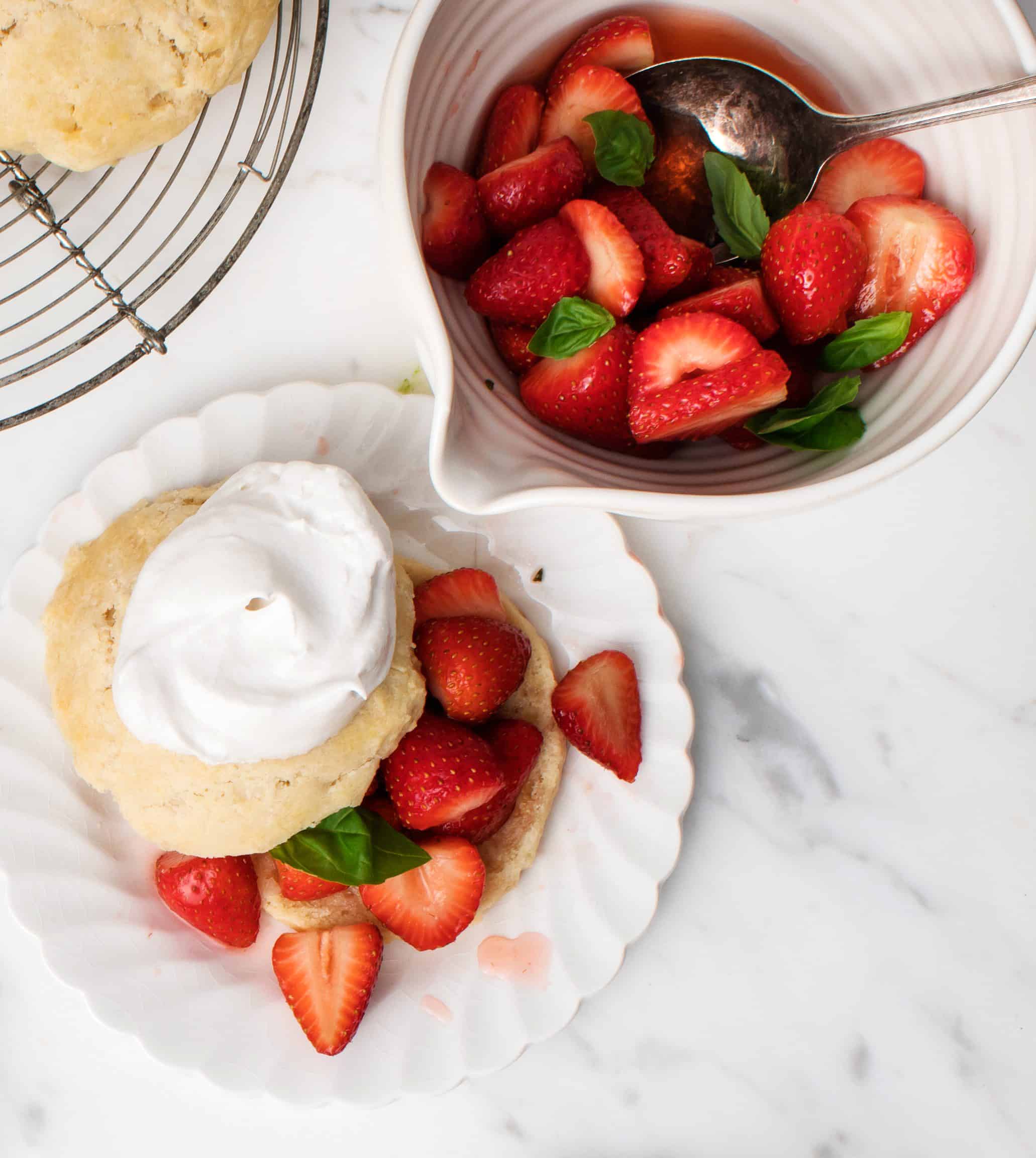 This classic strawberry shortcake recipe is a lovely, fresh dessert! I made mine fancy by mixing fresh basil into the strawberry mixture.