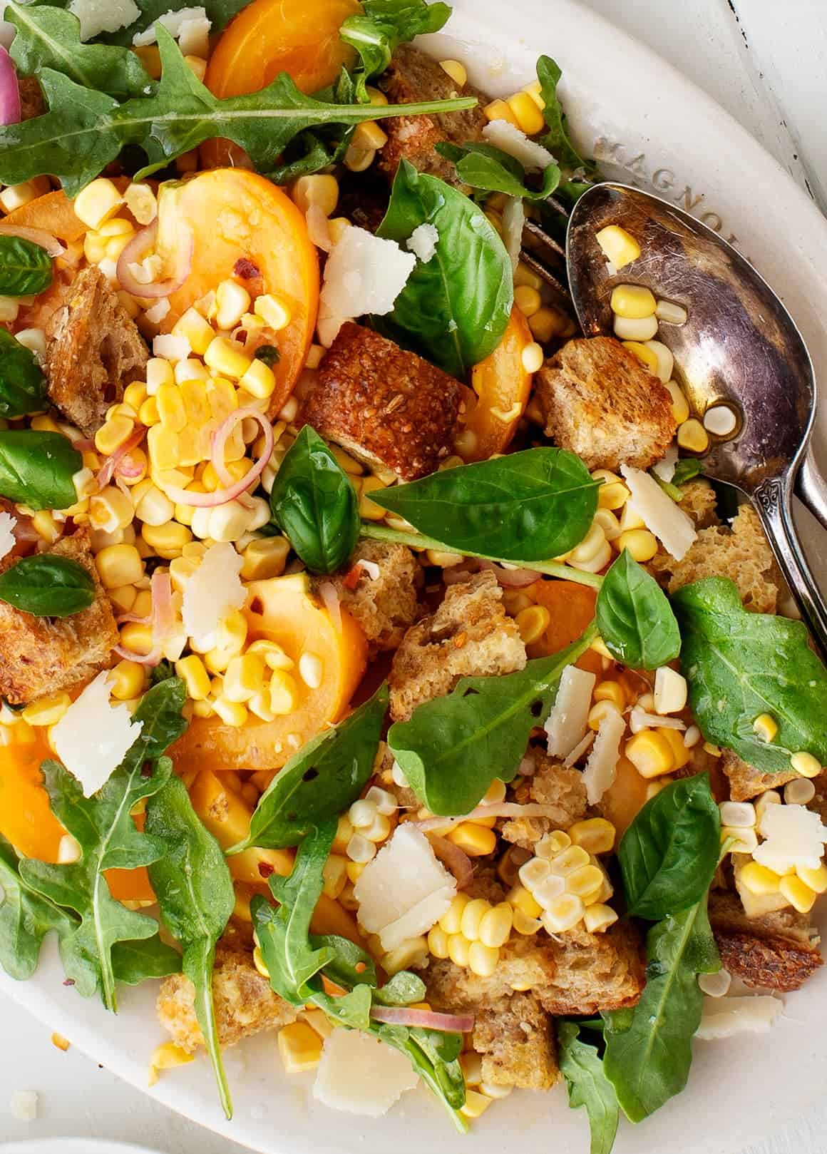 This one-bowl Sweet Corn & Arugula Panzanella is perfect for summer picnics! A healthy, satisfying vegetarian side, it can easily be made vegan.