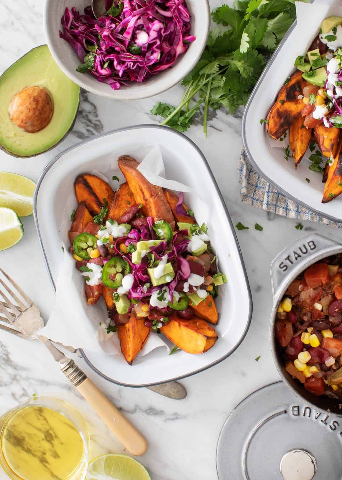 This fun meal can easily be made ahead of time. Cook the chili and prep the slaw in advance. Then roast the sweet potato wedges and assemble just before serving.