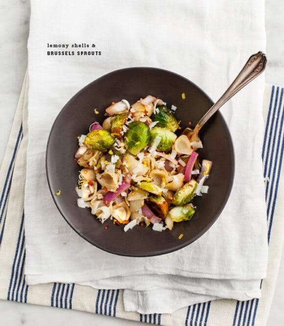 Toss together the shells, onions, brussels sprouts, more lemon juice, and most of the pecorino. Taste and adjust seasonings. Finish with remaining cheese, lemon zest and red pepper flakes.