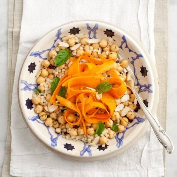Remove the garlic clove from the remainder of the dressing. Toss everything together - couscous & chickpeas, carrot ribbons, currants, toasted almonds, and fresh mint. Taste and adjust seasonings.
